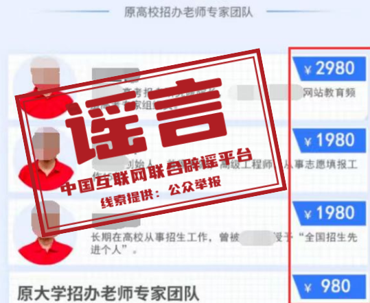 每年高考成绩发布后,一些社会培训机构和自媒体就通过“不浪费1分不浪费未来”“让每1分都发挥价值”等说法吸引流量,夸大志愿填报作用,制造贩卖志愿填报焦虑。然后,包装打造“专家”“名师”、虚假编造“内部信息”“内部数据”、宣称“大数据志愿辅导”“一对一咨询”等,诱导考生及家长购买高价甚至天价志愿填报咨询服务。
