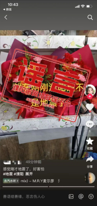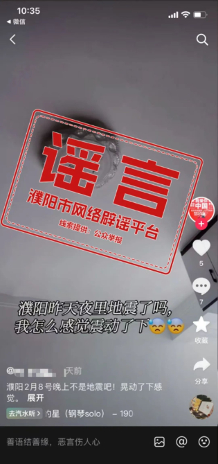 2月9日,账号“小**”“Q**”、“**麻麻”在网络视频平台发布“濮阳县八公桥镇六点五十五分地震了”“2月8日濮阳地震了”相关信息。经濮阳市委网信办向市防震减灾中心核实查证,2月8日至今,濮阳市周边100公里范围内未发生地震!消息为不实信息。