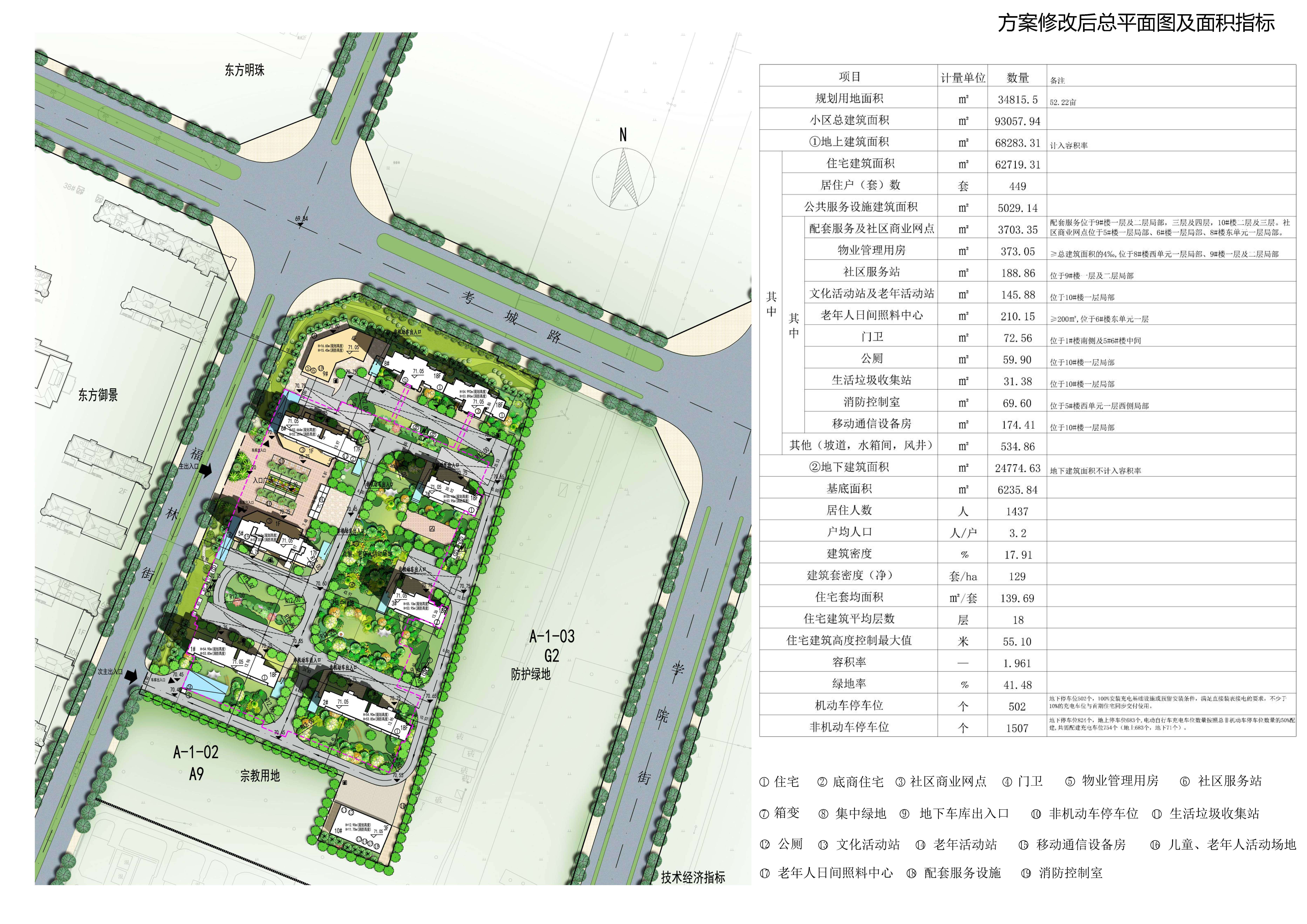 6、拟将经济技术指标变更如下:总建筑面积由93674.99㎡减少为93057.94㎡(减少了617.05㎡)。地上建筑面积由68642.95㎡减少为68283.31㎡(减少了359.64㎡),其中,住宅建筑面积由62403.22㎡增加为为62719.31㎡(增加了316.09㎡),配套服务及社区商业网点由5239.39㎡减少为3703.35㎡(减少了1536.04㎡),物业管理与服务由330.68㎡增加为373.05㎡(增加了42.37㎡),文化活动站72.49㎡和老年活动站72.5㎡变更为文化活动站级老年活动站145.88㎡(增加了0.89㎡),新增老年人日间照料中心210.15㎡,公厕由59.13㎡增加为59.9㎡(增加了0.77㎡),生活垃圾收集站由30.78㎡增加为31.38㎡(增加了0.6㎡),移动通信设备房由173.34㎡增加为174.41㎡(增加了1.07㎡),新增消防控制室69.6㎡,门卫72.56㎡保持不变,新增坡道、水箱间及风井建筑面积534.86㎡。地下建筑面积由25032.04㎡减少为24774.63㎡(减少257.41㎡)。