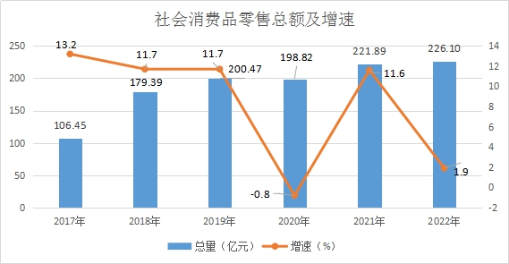 2022年,全县社会消费品零售总额226.10亿元,同比增长1.9%。分城乡看,城镇消费品零售额169.70亿元,同比增长2.4%;乡村消费品零售额56.40亿元,同比增长0.4%。分行业看,批发业零售额11.40亿元,同比增长1.1%;零售业零售额183.30亿元,同比增长3.7%;住宿业零售额1.80亿元,同比下降7.9%;餐饮业零售额29.70亿元,同比下降7.0%。