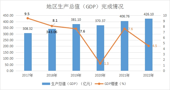 根据地区生产总值统一核算结果,2022年全县生产总值426.10亿元,同比增长4.5%。其中,第一产业增加值55.08亿元,同比增长5.0%;第二产业增加值189.79亿元,同比增长6.0%;第三产业增加值181.23亿元,同比增长2.8%。三次产业结构为12.9:44.6:42.5,三次产业对GDP的贡献率依次为15.2%、57.5%、27.3%,分别拉动GDP增长0.7个、2.6个和1.2个百分点。