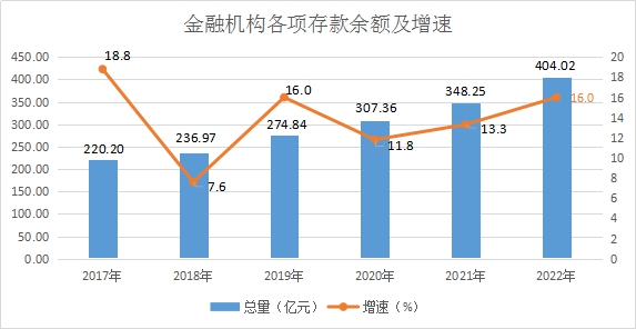 全县年末金融机构各项存款余额404.02亿元,同比增长16.0%。其中住户存款307.05亿元,同比增长17.0%。各项贷款余额351.21亿元,同比增长21.0%。