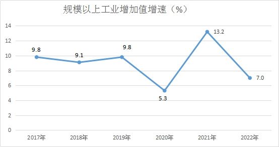 2022年,全县规模以上工业企业253家,规模以上工业企业增加值同比增长7.0%。分经济类型看,在规模以上工业企业中,股份合作企业同比下降69.8%,有限责任公司同比增长5.4%,私营企业同比增长8.4%,外商投资企业同比增长2.5%,港澳台商投资企业同比增长4.0%;产品销售率95.9%。分门类看,制造业增长7.6%,电力、热力、燃气及水的生产和供应业下降13.7%。五大主导产业增加值比上年增长19.0%,占规模以上工业的37.8%;传统支柱产业增加值下降0.2%,占规模以上工业的24.5%。高技术产业增加值增长40.0%,占规模以上工业的25.1%;高新技术产业增加值增长18.5%,占规模以上工业的49.2%;高成长产业增加值增长9.1%,占规模以上工业的69.3%;战略性新兴产业增加值增长8.7%,占规模以上工业的20.5%。