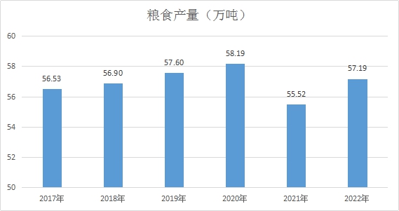 粮食产量57.19万吨,同比增长3.0%。其中,夏粮产量36.21万吨,同比增长0.6%;秋粮产量20.98万吨,同比增长7.5%。小麦产量36.21万吨,同比增长0.6%;玉米产量18.81万吨,同比增长9.7%。