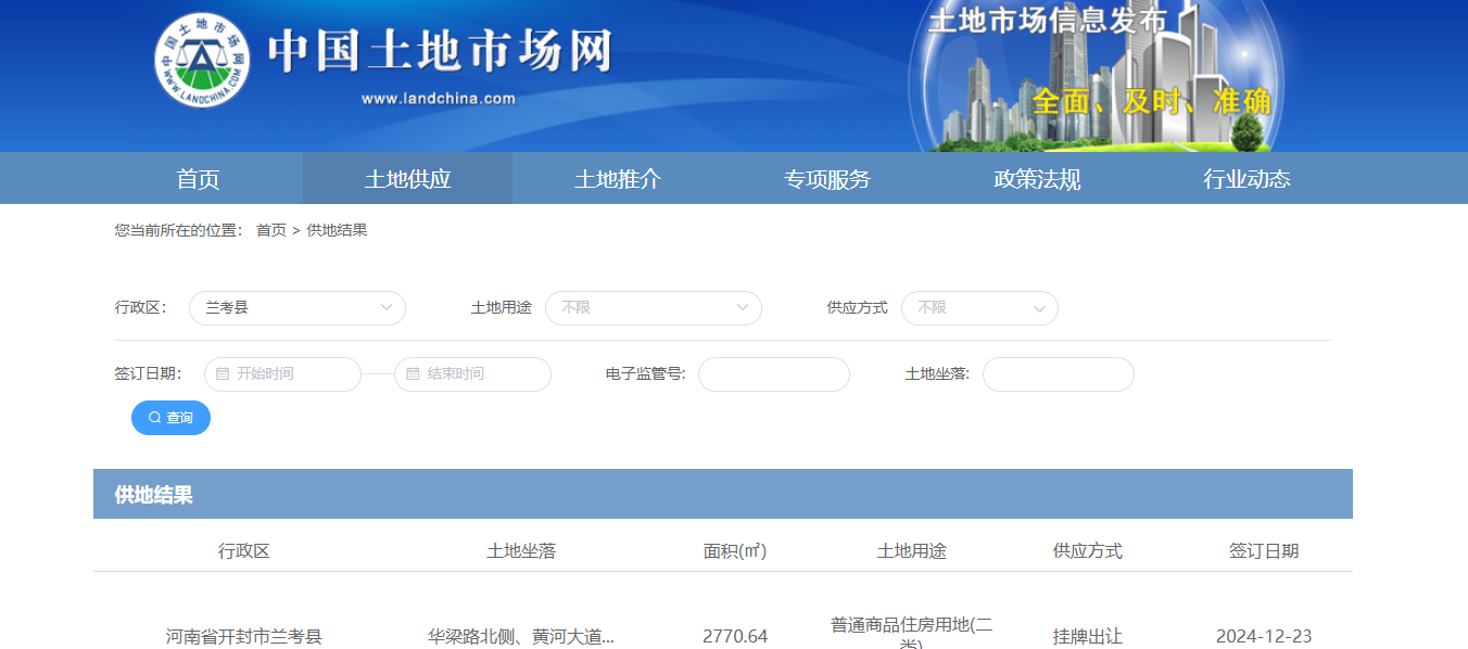 进入中国土地市场网“土地供应”查询供地结果选择兰考县,即可查询到国有土地使用权出让和划拨信息。