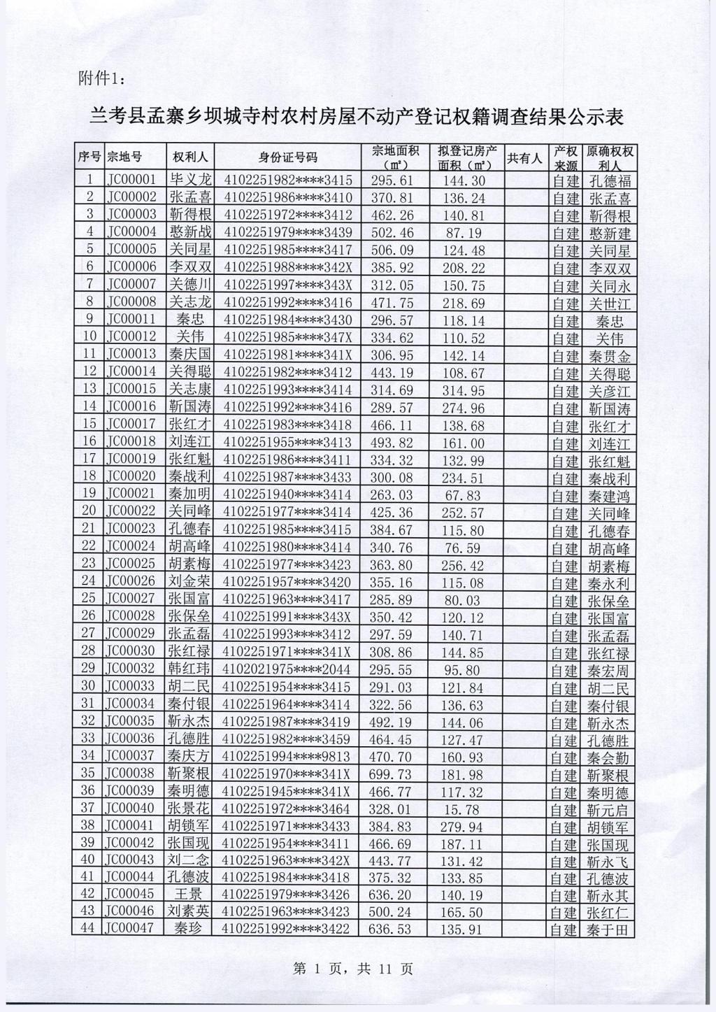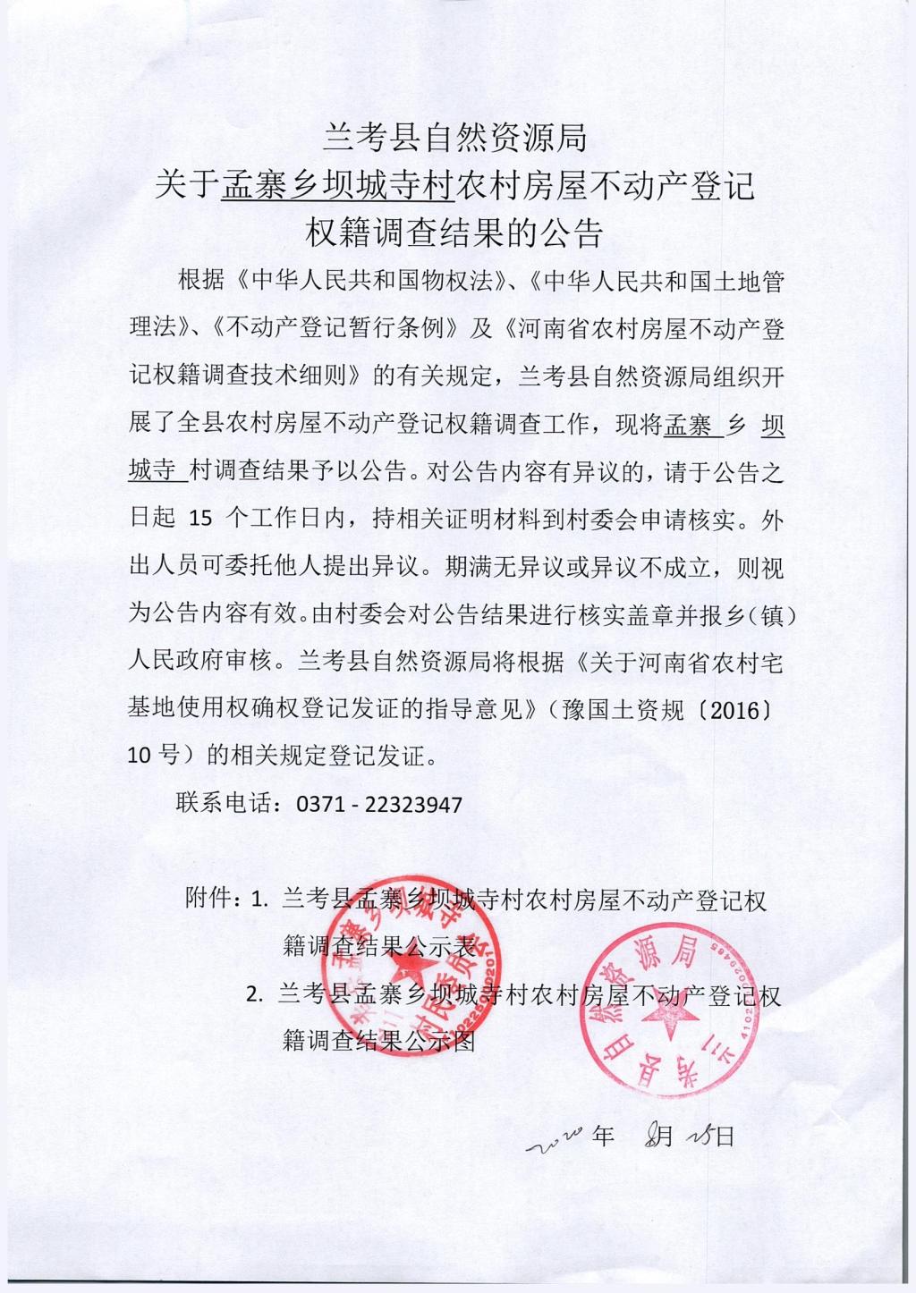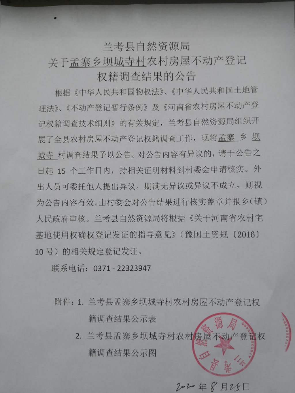 兰考县农村房屋不动产登记关于孟寨乡坝城寺村权籍调查结果的公示公告