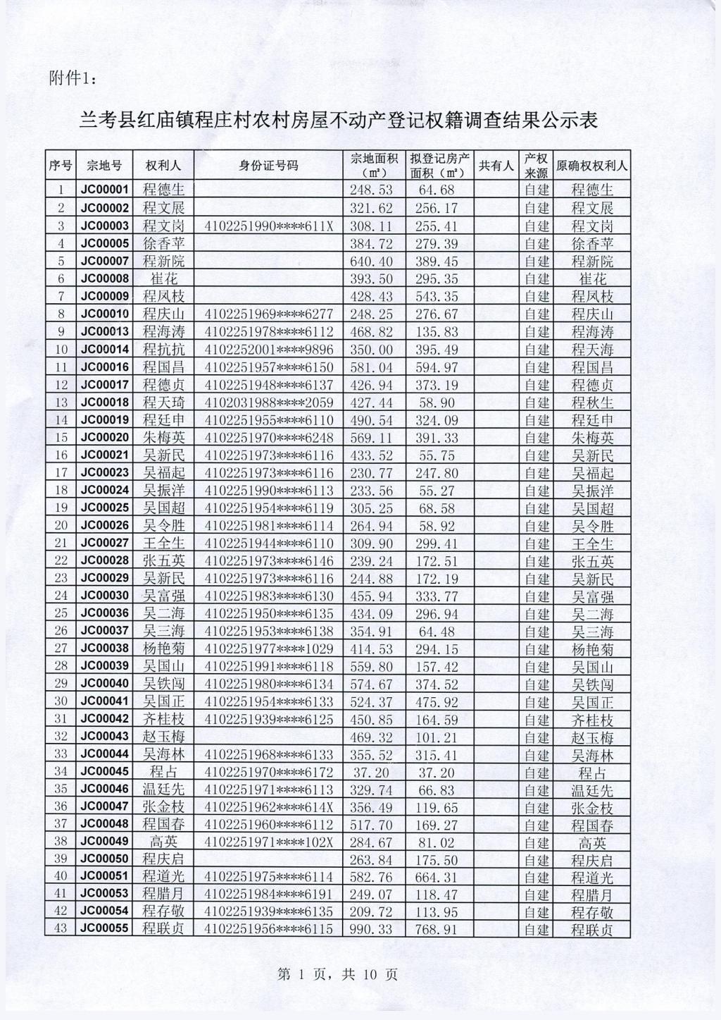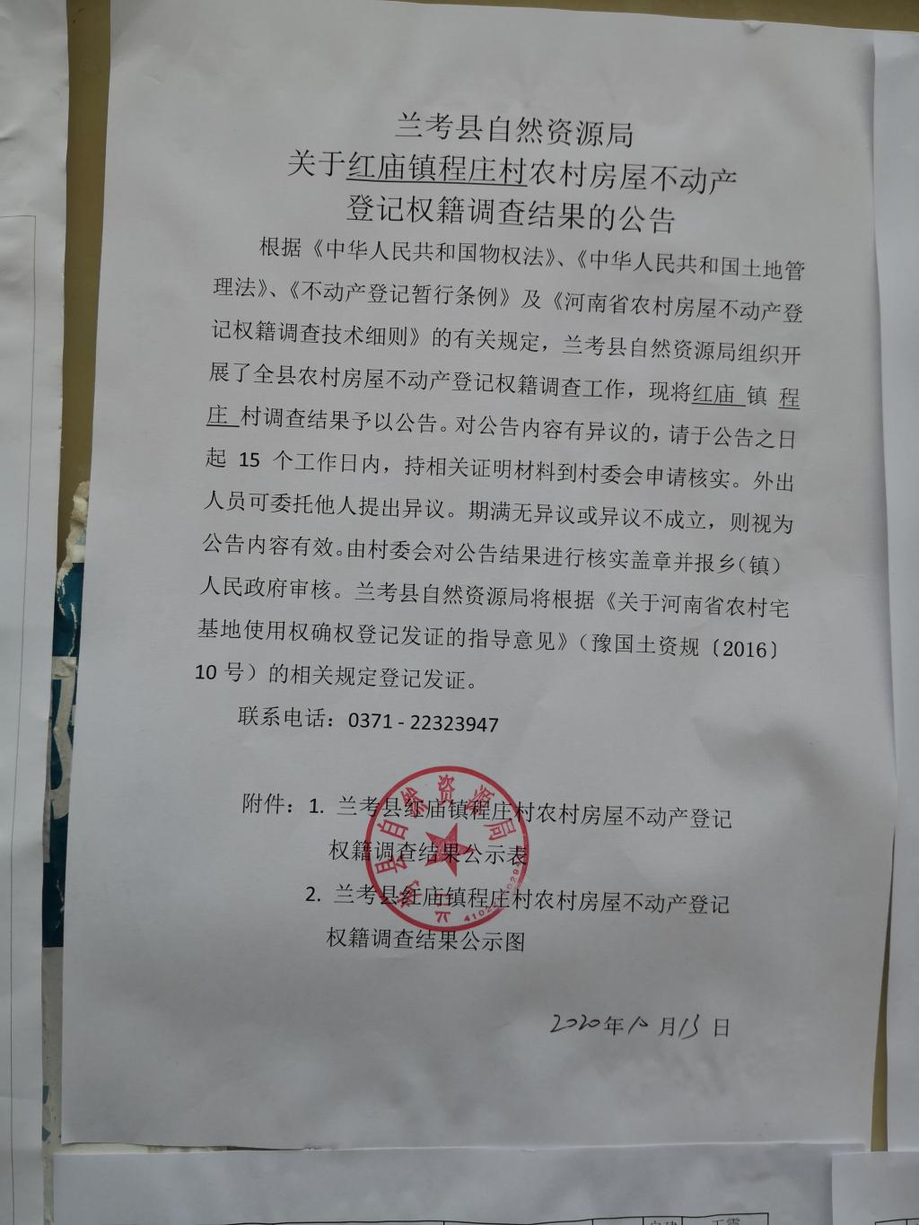 兰考县农村房屋不动产登记关于红庙镇程庄村权籍调查结果的公示公告