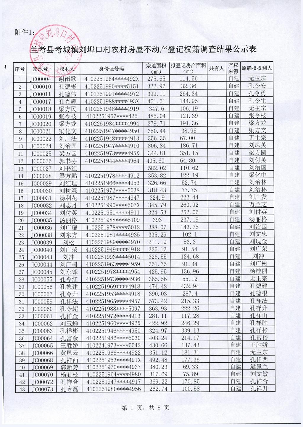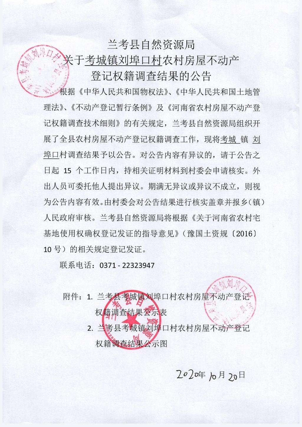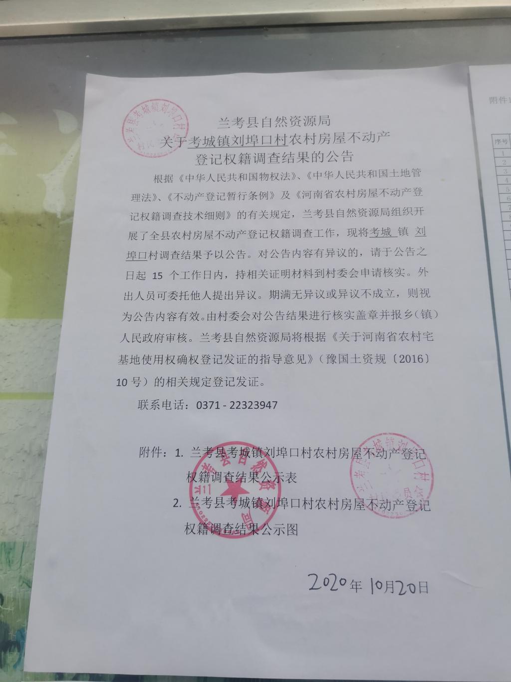 兰考县农村房屋不动产登记关于考城镇刘埠口村权籍调查结果的公示公告