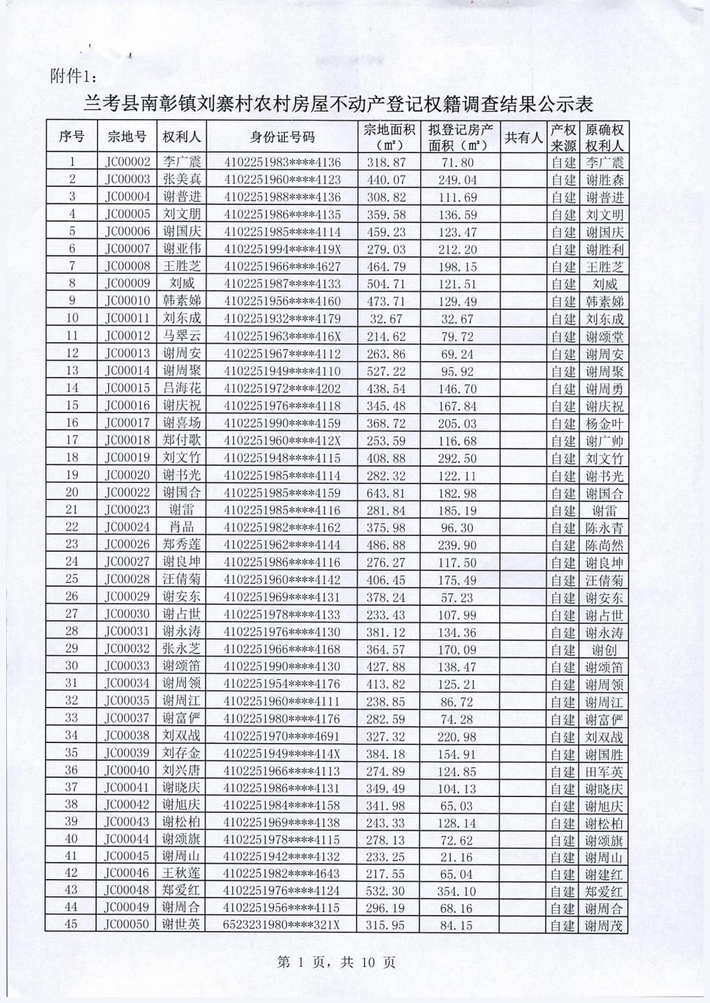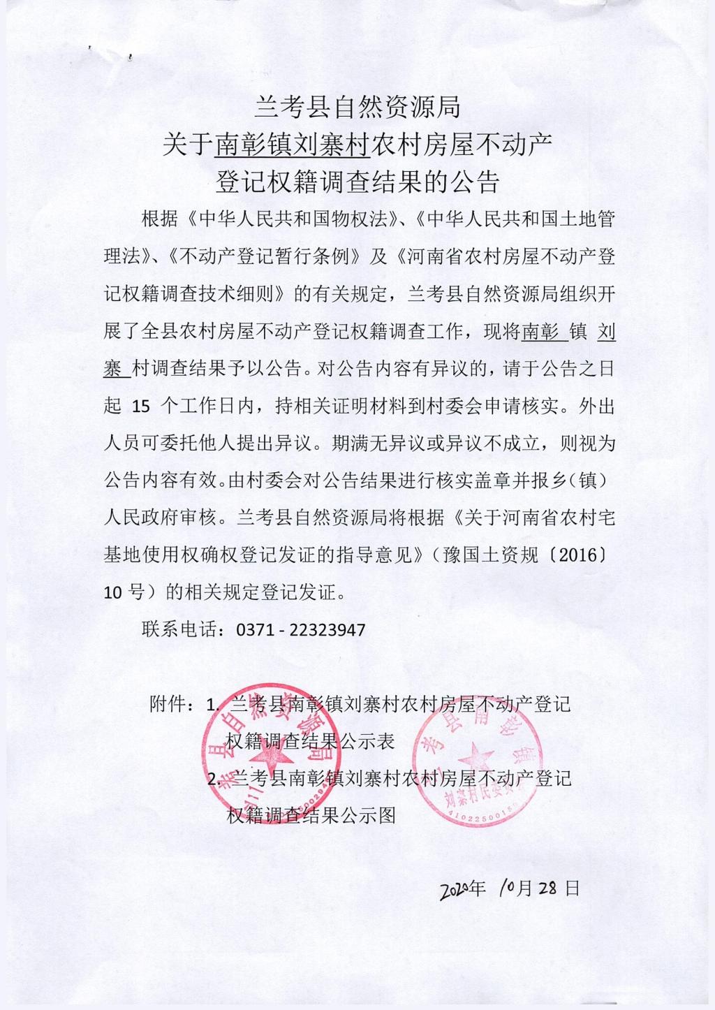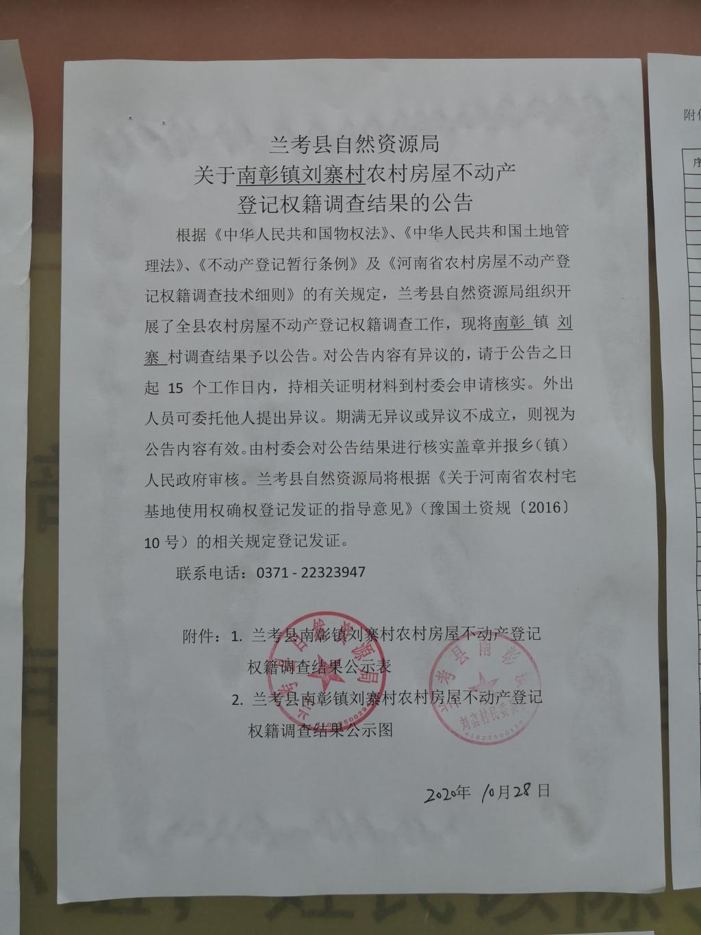 兰考县农村房屋不动产登记关于南彰镇刘寨村权籍调查结果的公示公告